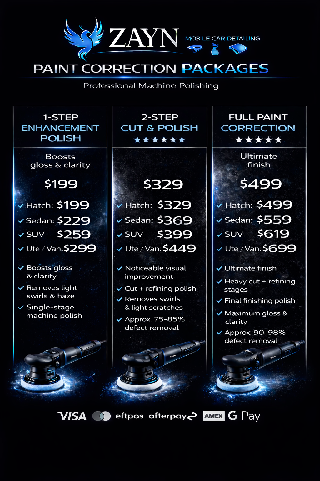 Restore your vehicle’s finish with professional paint correction tailored to every level of wear. Zayn Mobile Car Detailing offers three progressive packages designed to remove defects, boost gloss, and protect your paint—perfect for newer cars, daily drivers, and show-quality restorations.